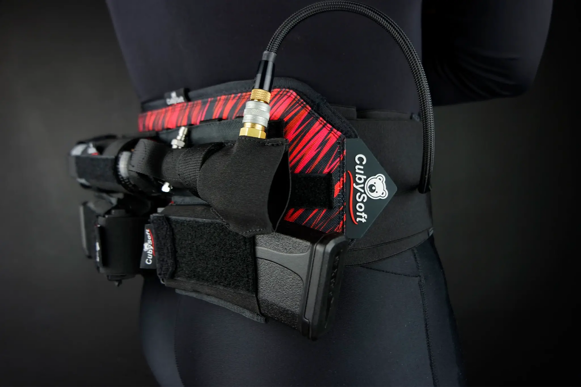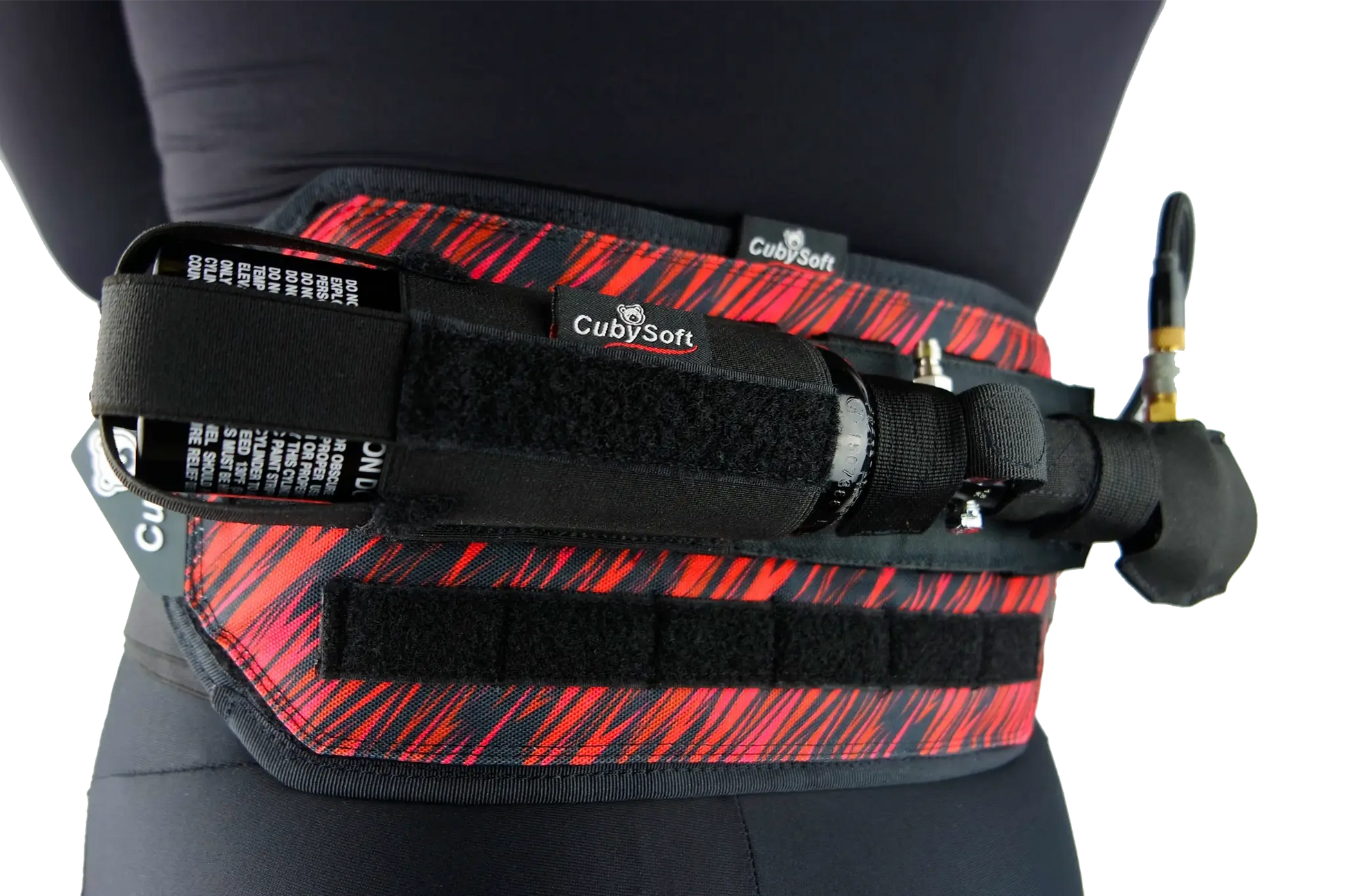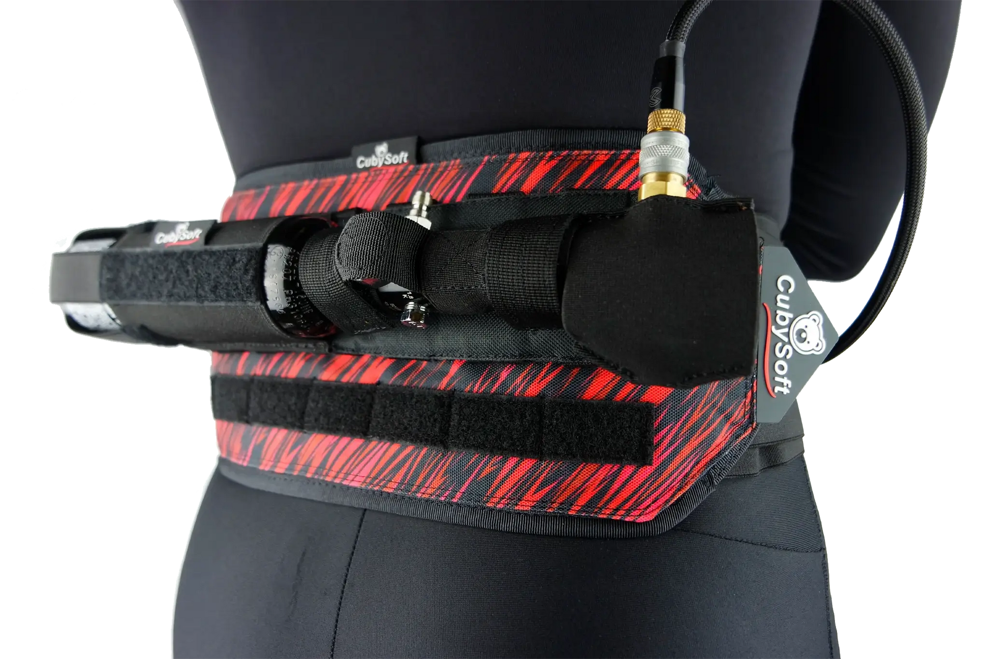 The CubySoft® Thunder Tank Pouch 0.2-0.4L Black is a tactical pouch designed to securely carry your HPA tank in a horizontal position, compatible with MOLLE systems and Pro Harness setups.